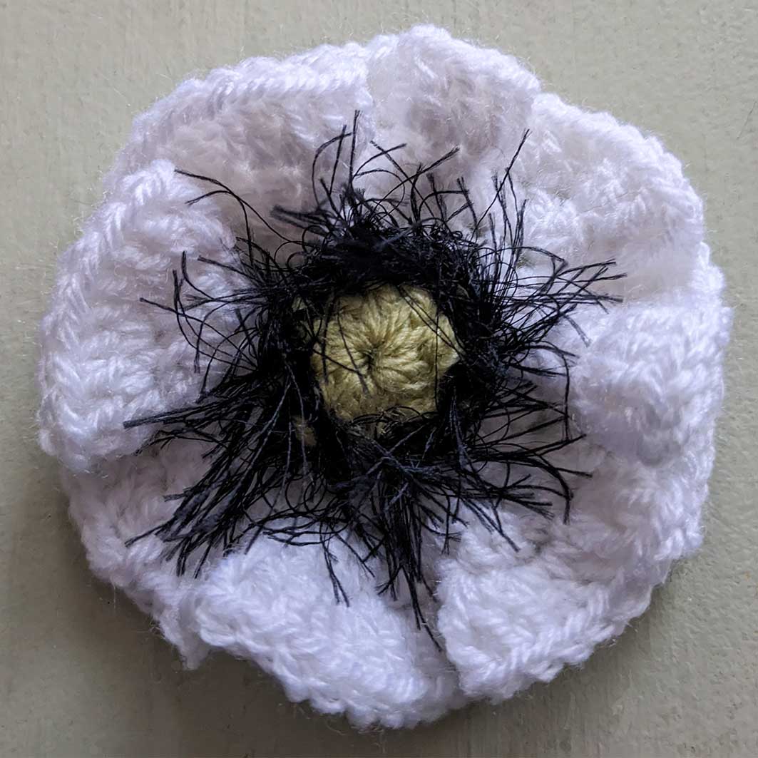 crochet poppy in white yarn, with a green centre and fluffy, black, eyelash yarn. Signifying peace.