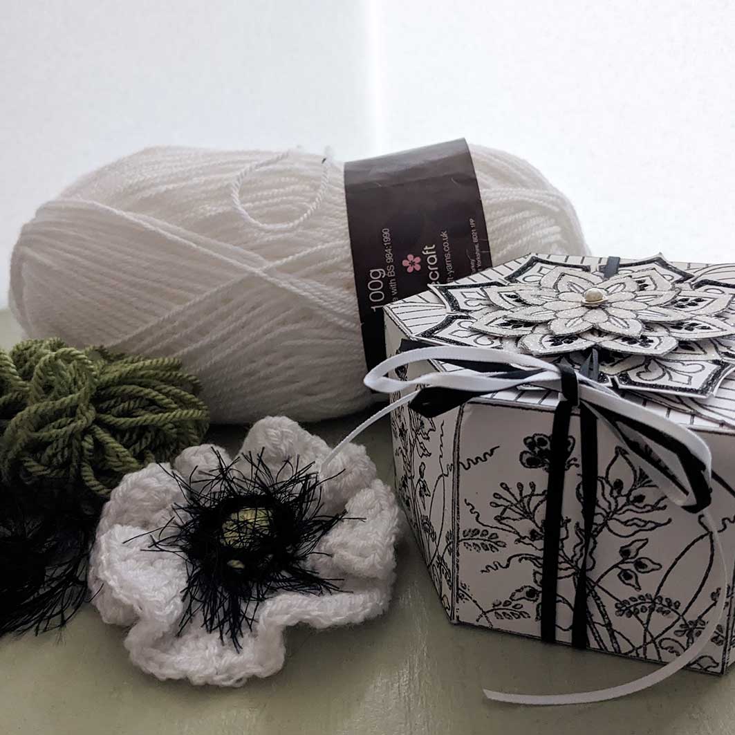 White crochet poppy with the gift box.